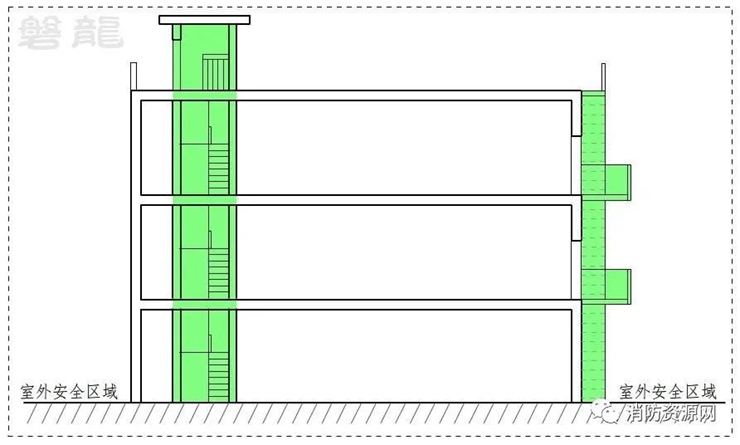 需要說明的是,對(duì)于設(shè)置在建筑外墻上的室外疏散樓梯,雖然處于室外區(qū)域,但受制于建筑結(jié)構(gòu)及外墻的耐火極限影響,仍屬于室內(nèi)安全區(qū)域。(圖示3)