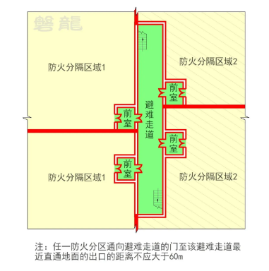 (2)疏散走道:是疏散通道的一部分,通常指從房間疏散門至安全出口之間的路徑。