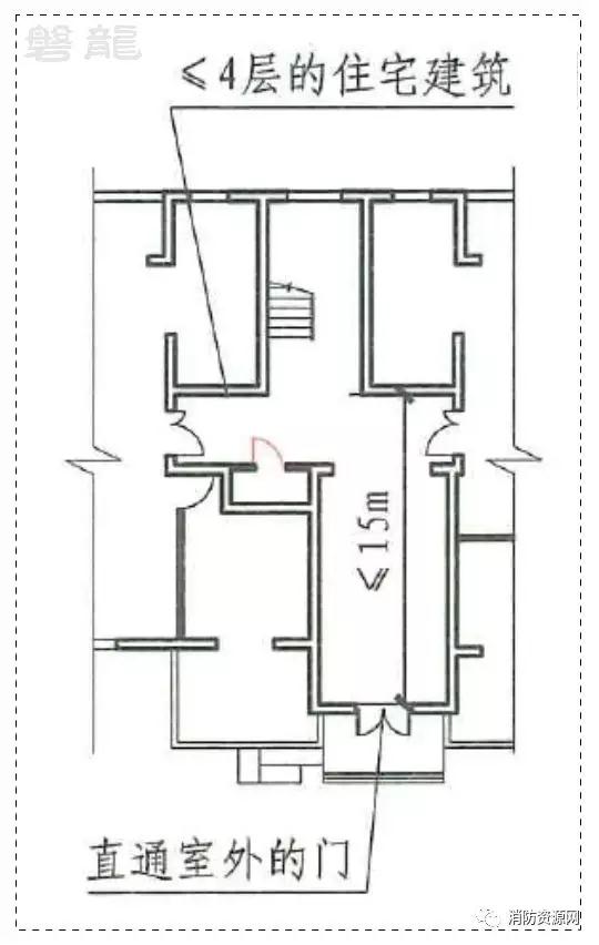 本條所述“層數(shù)不超過(guò)4層時(shí),可將直通室外的門設(shè)置在離樓梯間不大于15m處”的情況,應(yīng)僅適應(yīng)于敞開(kāi)樓梯間,原因如下:1、“公津建字【2015】27號(hào)”文件明確了“樓梯間應(yīng)在首層直通室外,確有困難時(shí),可在首層采用擴(kuò)大的封閉樓梯間或防煙樓梯間前室”。依此文要求,當(dāng)樓梯間不能在首層直通室外時(shí),封閉樓梯間或防煙樓梯間均應(yīng)采用擴(kuò)大的封閉樓梯間或防煙樓梯間前室的方式直通室外。2、規(guī)范圖示也清晰表述了是適于敞開(kāi)樓梯間的形式: