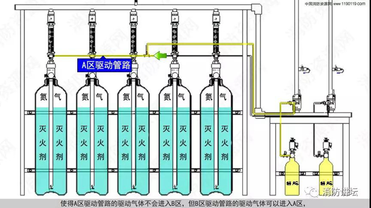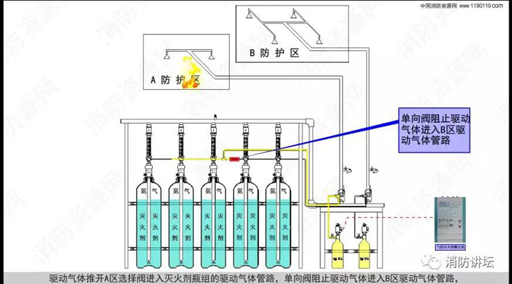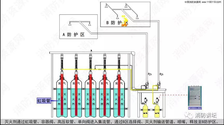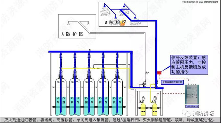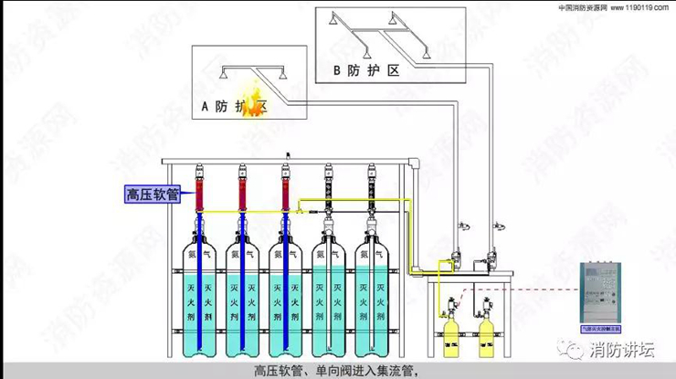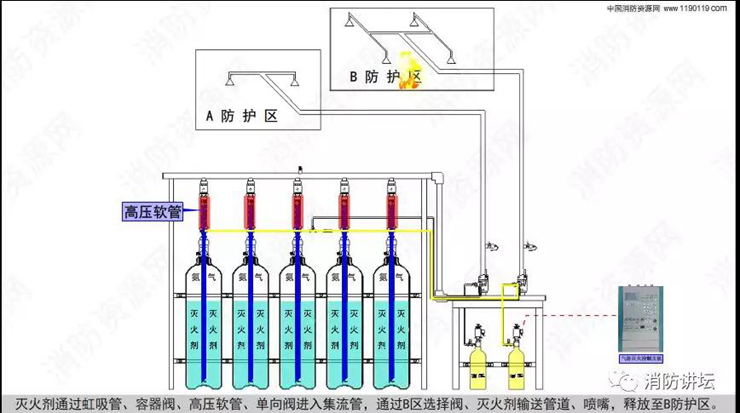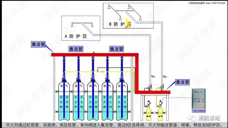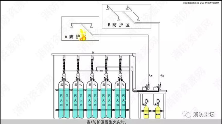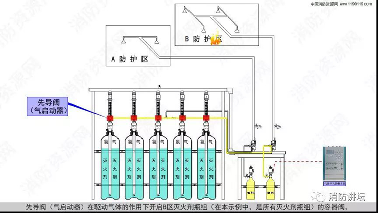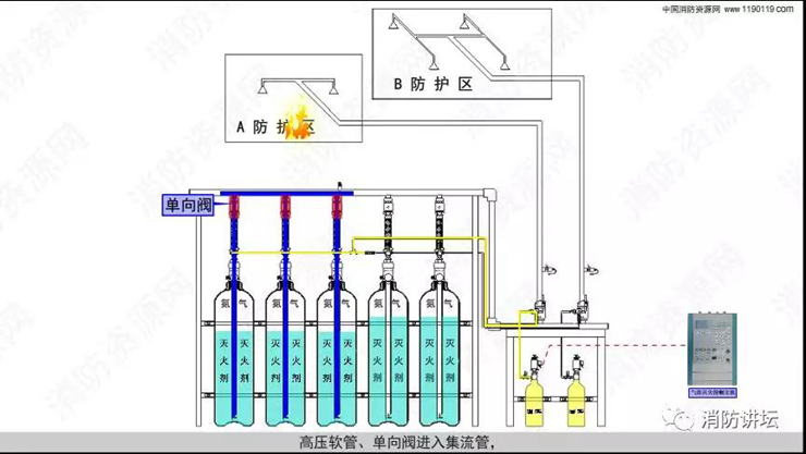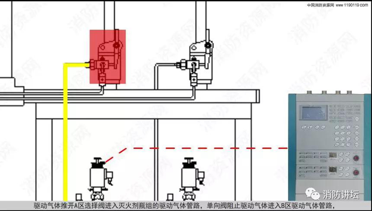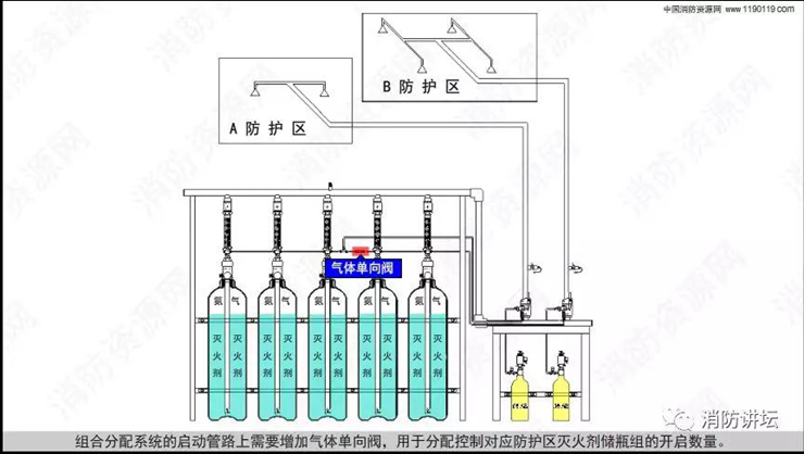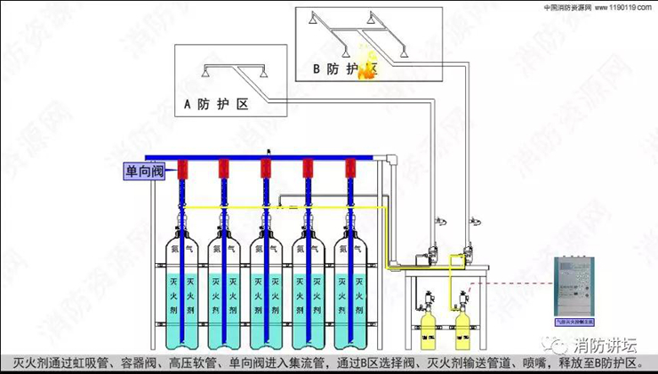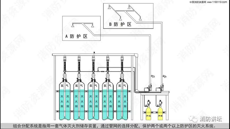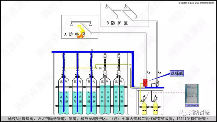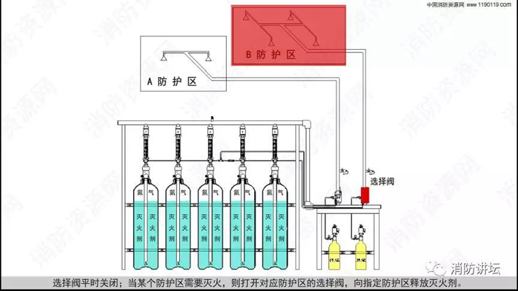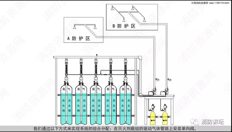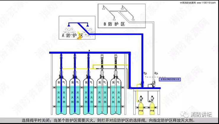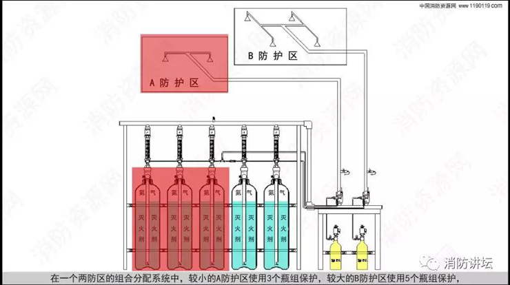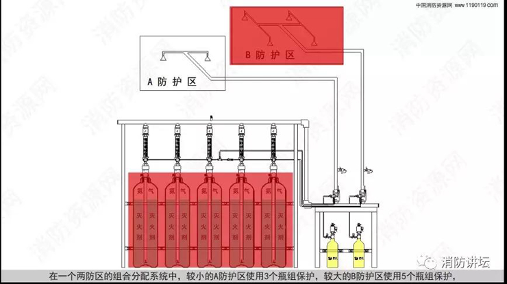 組合分配系統(tǒng)中,多個防護區(qū)的選擇閥和滅火劑瓶組如何實現(xiàn)自動分配?