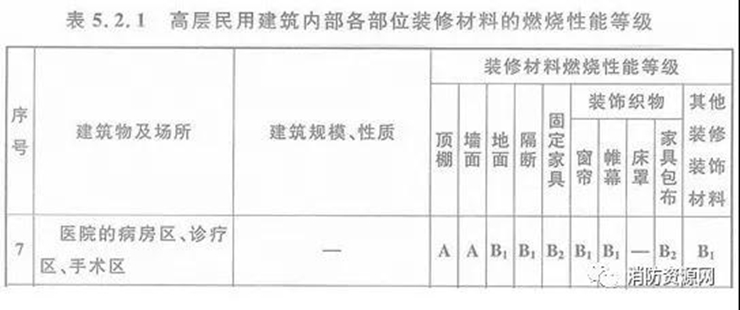 二、高層醫(yī)院建筑的病房區(qū)、診療區(qū)、手術(shù)區(qū),內(nèi)部各部位裝修材料的燃燒性能等級,不應(yīng)低于《建筑內(nèi)部裝修設(shè)計防火規(guī)范》表5.2.1的規(guī)定。