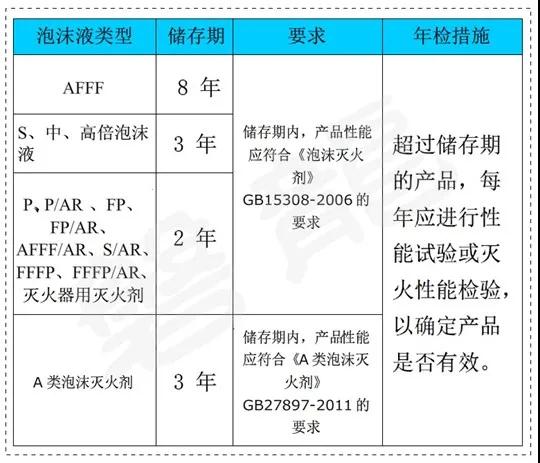 2、泡沫滅火劑的儲存期、儲存要求以及年檢措施如下: