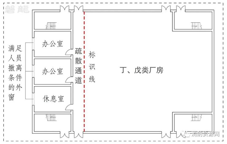 火災(zāi)事實證明,在火災(zāi)條件下,人員很難識別和嚴格按照劃線標識進行疏散,對于辦公室和休息室,有必要設(shè)置疏散走道,通過疏散走道通向安全出口。