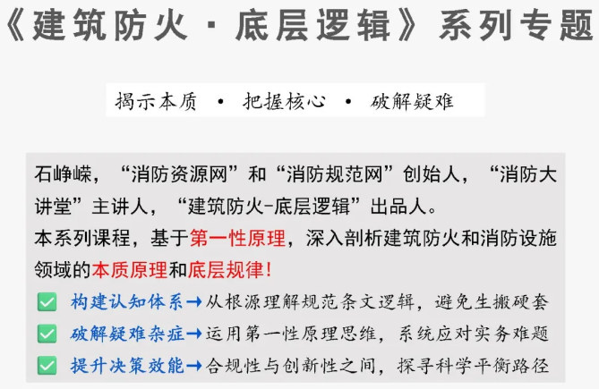 石崢嶸:《建筑防火·底層邏輯》系列專題——安全疏散-第7部分:雙向、單向走道與疏散距離的適應原則及應用。理解雙向、單向走道的規(guī)范適應原則,可系統(tǒng)解決走道的疏散距離問題。 基于第一性原理,深入剖析建筑防火和消防設施領域的本質原理和..
